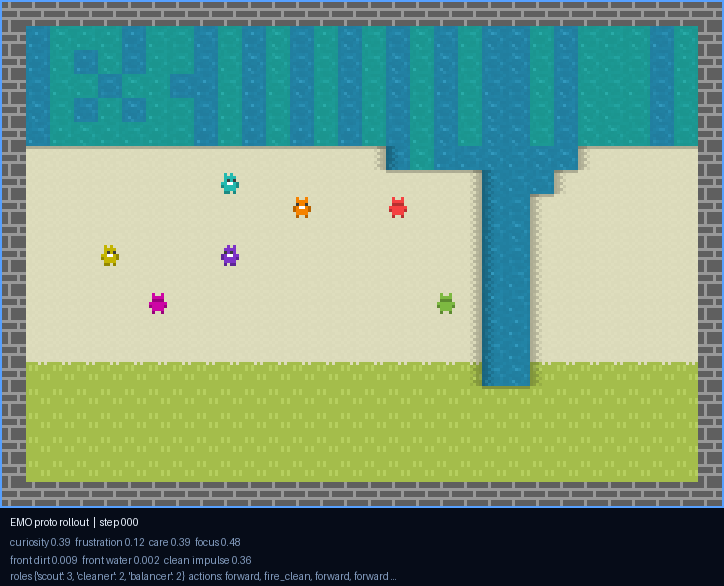 Der Visual-Pfad verwendet den offiziellen `Melting Pot` `human_players`-Entry-Point nur fuer die nackte Task-Ansicht. Ganz oben steht jetzt zuerst der aktuelle Winner, danach der reward-bearing `role bridge`-Anchor, darunter der aeltere `EMO proto rollout`, dann der `trained baseline rollout` sobald wirklich ein Checkpoint vorliegt, danach das `task rollout sample` und ganz unten die statische Aufgabenkarte. So bleibt klar getrennt, was gerade unser funktionierender Winner ist, was der strukturelle Anchor ist, was nur Emotions-Prototyp war und was bloßer Aufgaben-Kontext ist.